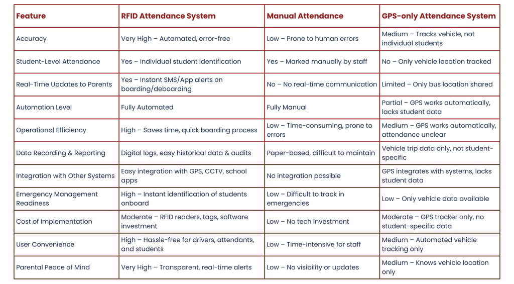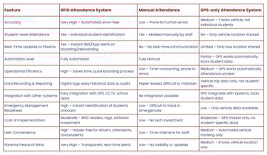 Comparison Chart: RFID vs Manual vs GPS-only Attendance Systems